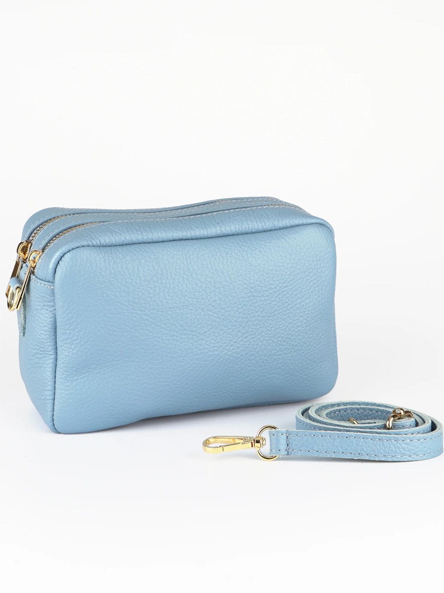 This azure blue crossbody bag is crafted from genuine Italian leather. Featuring two compartments, zip closure and classic gold hardware. This luxurious bag includes a removable adjustable strap allowing it to be worn over the shoulder or carried cross body.
