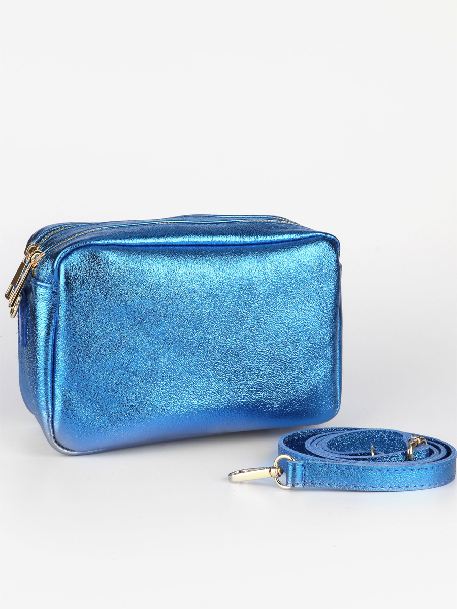 This metallic blue crossbody bag is crafted from genuine Italian leather. Featuring two compartments, zip closure and classic gold hardware. This luxurious bag includes a removable adjustable strap allowing it to be worn over the shoulder or carried cross body.