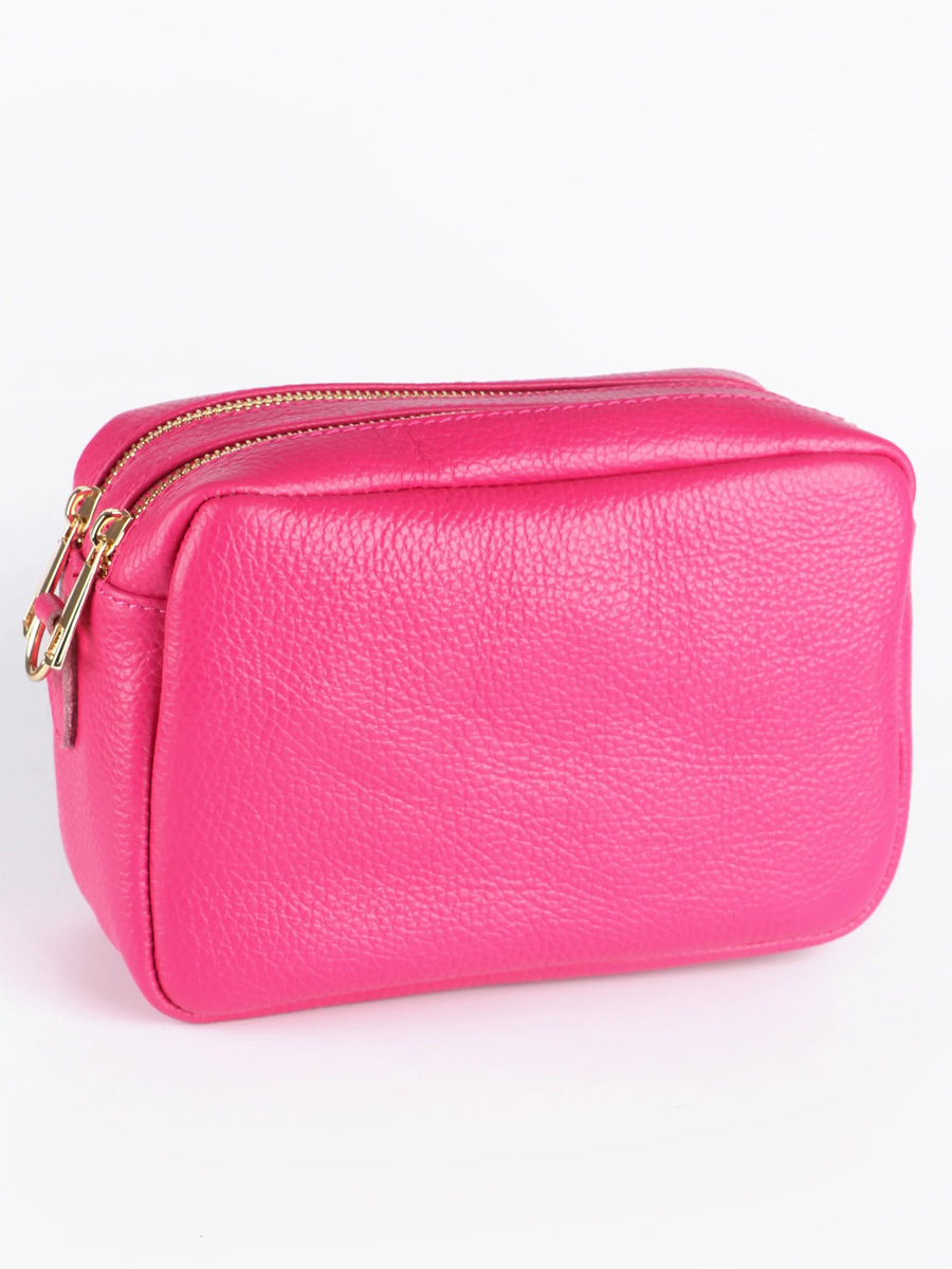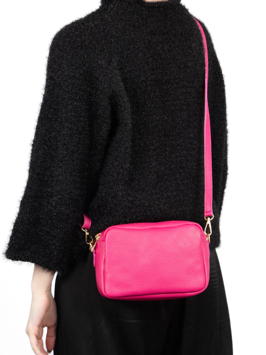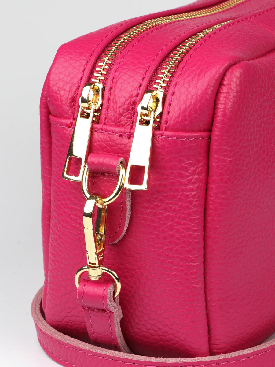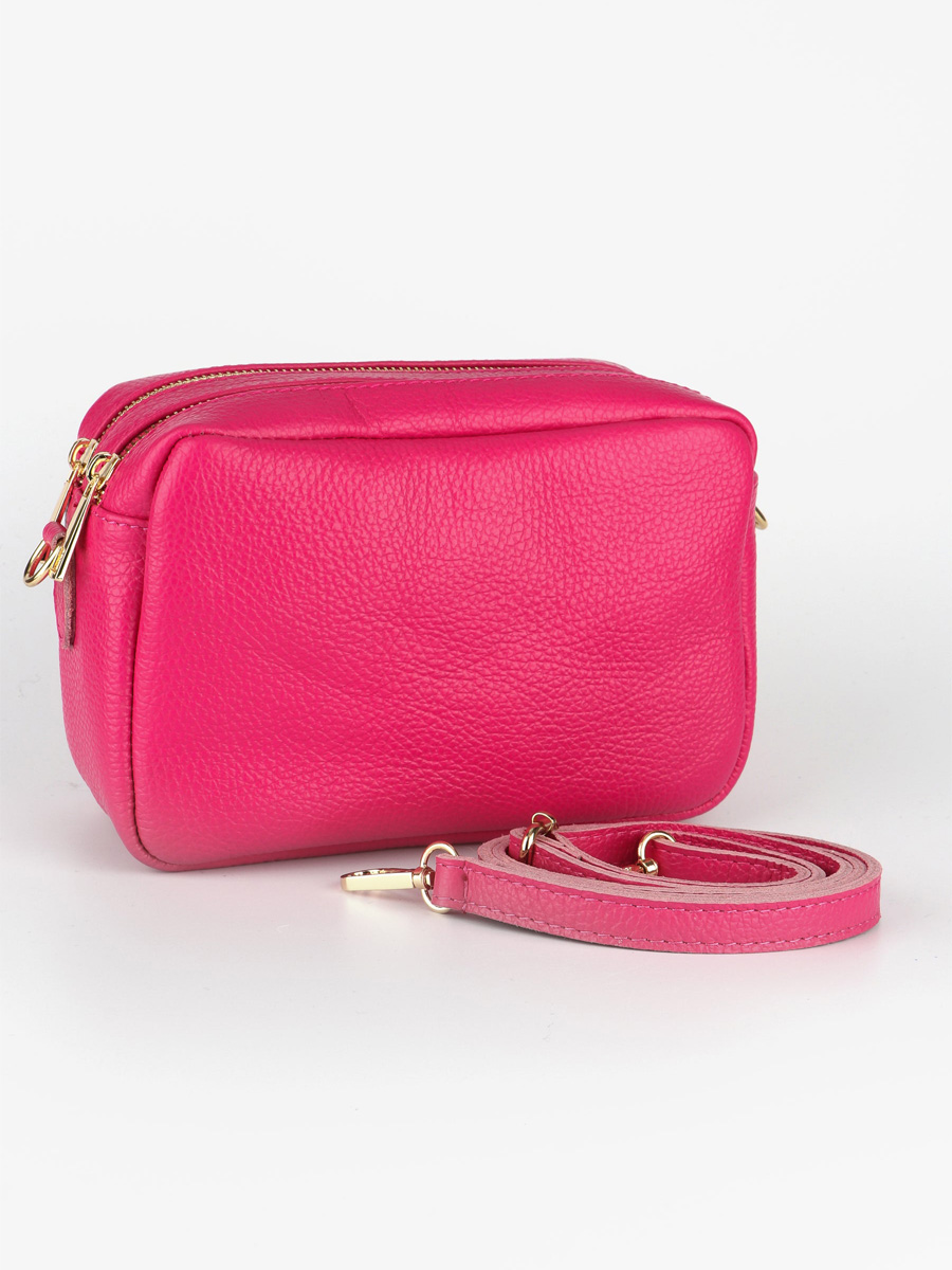 This bold raspberry pink crossbody bag is crafted from genuine Italian leather. Featuring two compartments, zip closure and classic gold hardware. This luxurious bag includes a removable adjustable strap allowing it to be worn over the shoulder or carried cross body.