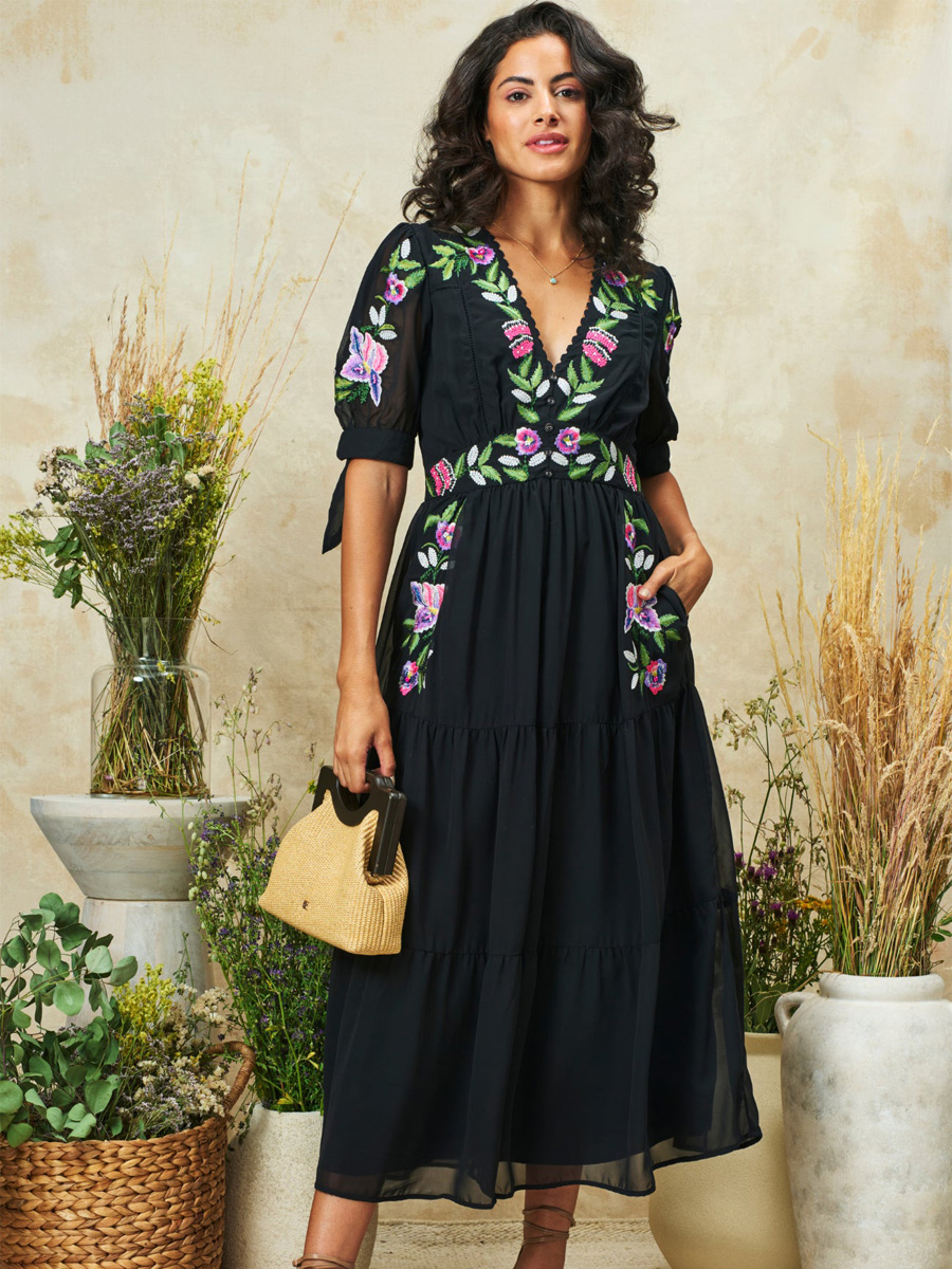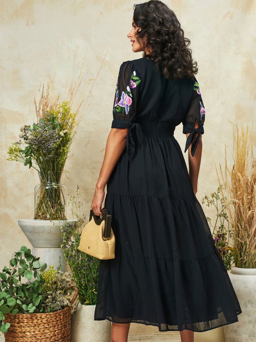 The April embroidered Tie Sleeve V-Neck Midi Dress With Tiered Skirt
