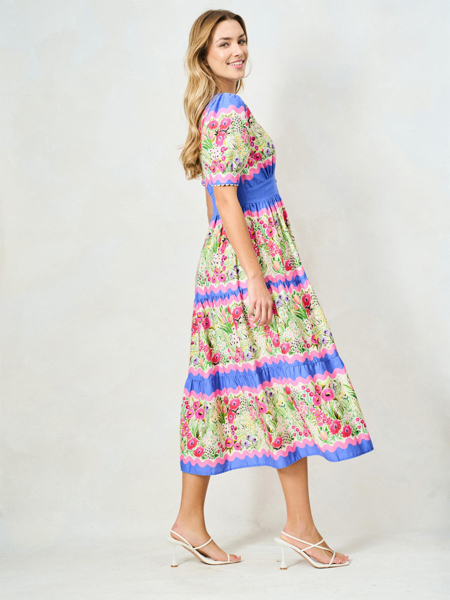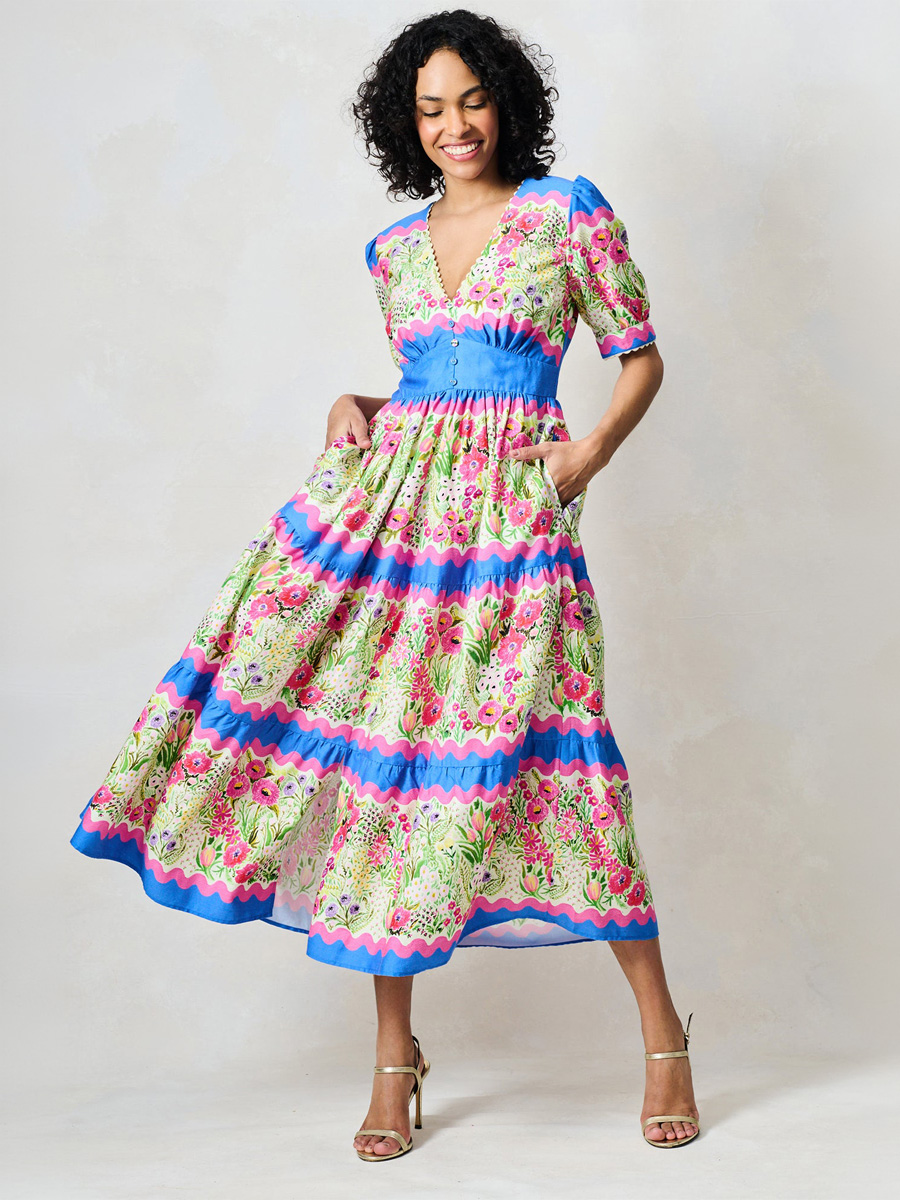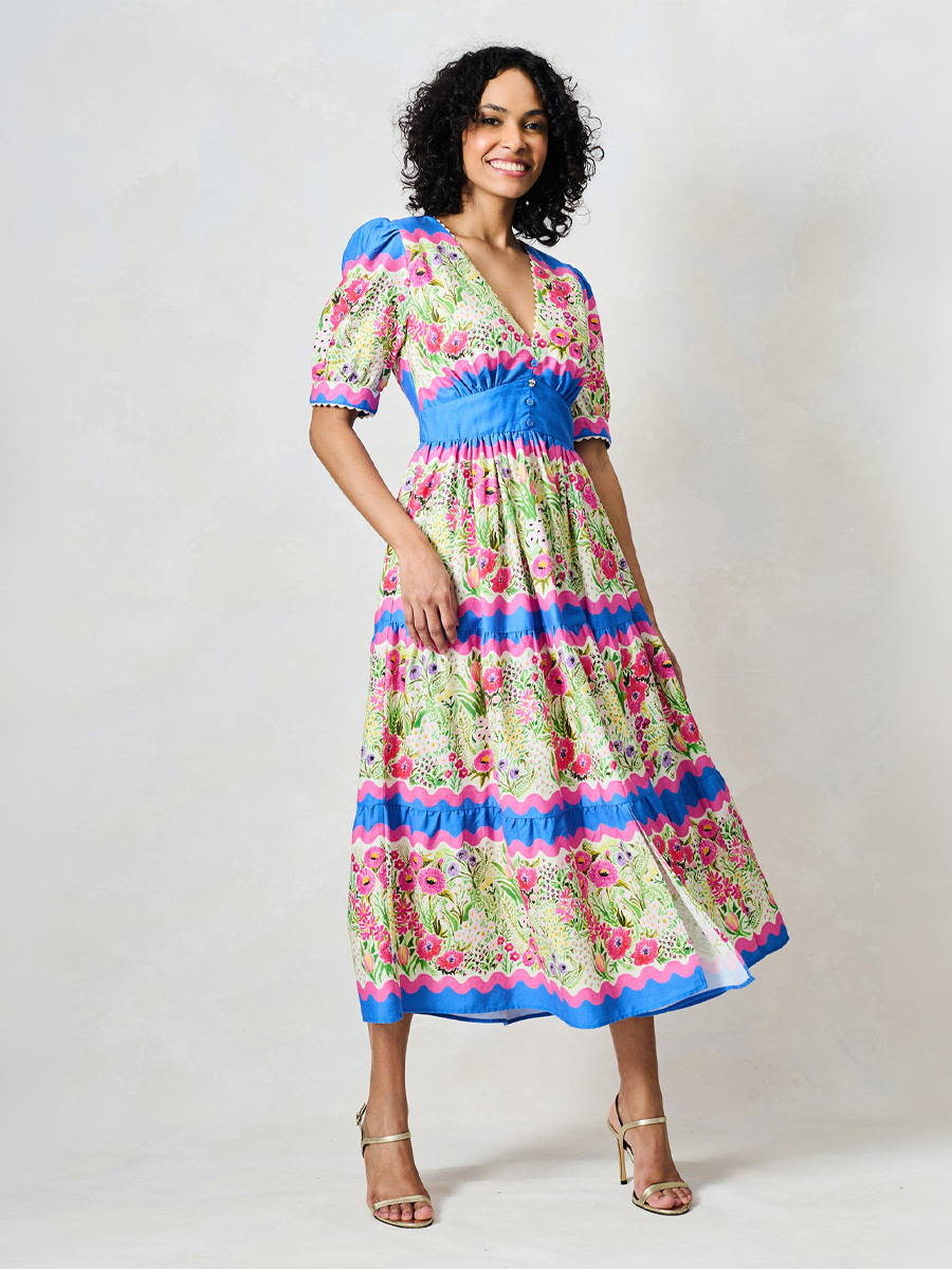 The Jo is a sweet, uplifting tea dress designed to ease you into the new season. A V neckline and soft puff sleeves create a flattering silhouette, with a full skirt offering gentle movement and charm. In a blue and pink multi print, it brings a playful yet polished touch to early spring plans.