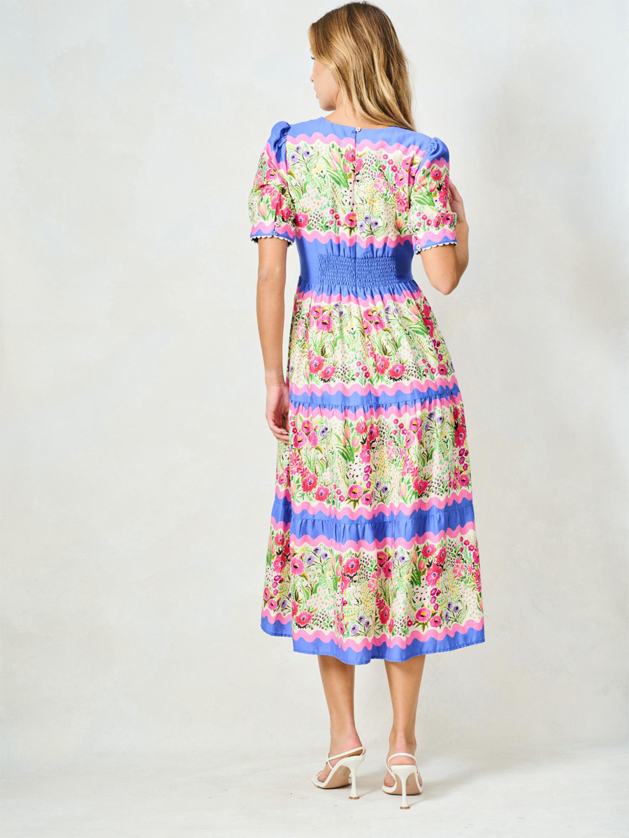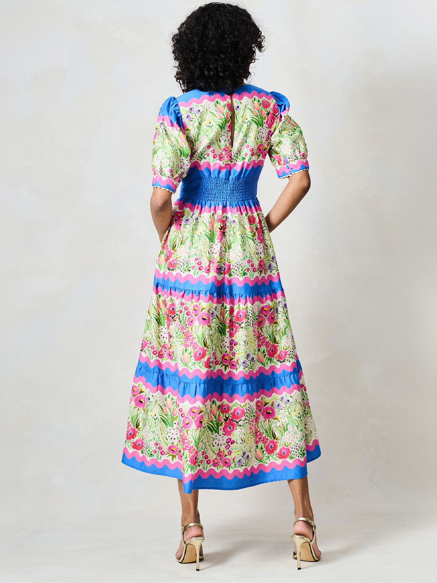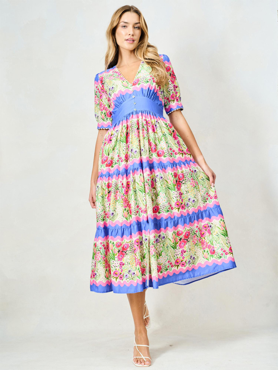 The Jo is a sweet, uplifting tea dress designed to ease you into the new season. A V neckline and soft puff sleeves create a flattering silhouette, with a full skirt offering gentle movement and charm. In a blue and pink multi print, it brings a playful yet polished touch to early spring plans.