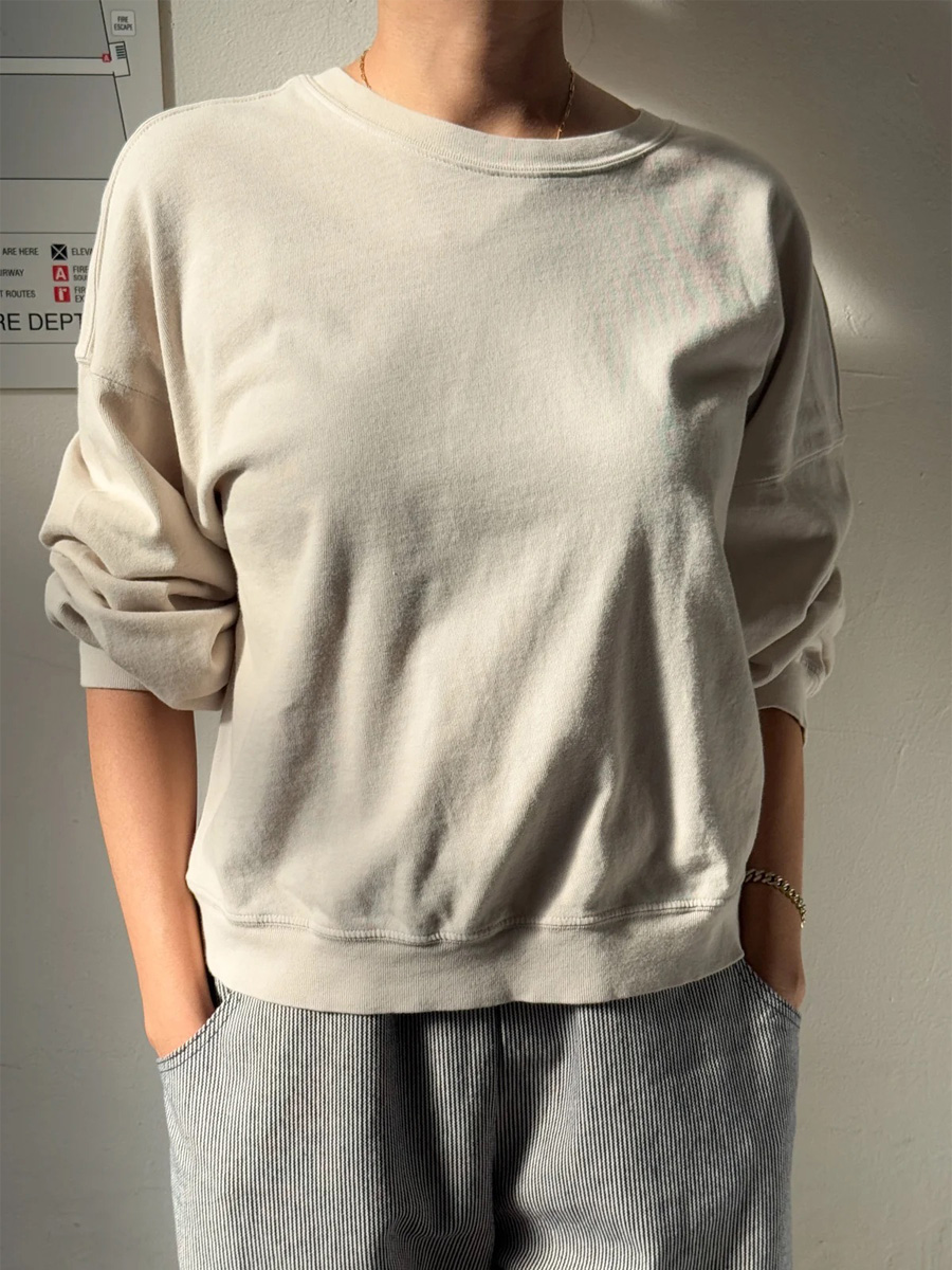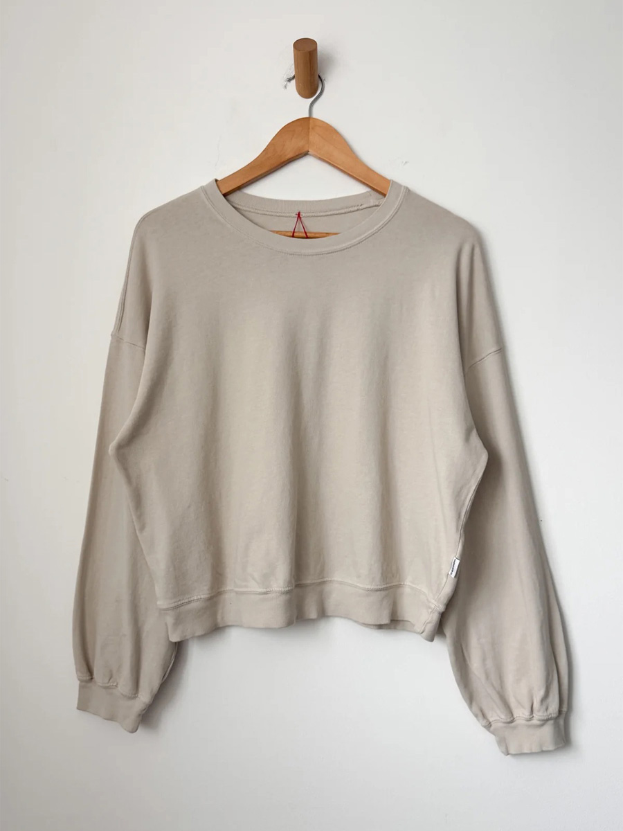 The Cali Jersey Sweatshirt blends the best of The Little Boy Tee and the Poche Top for a playful take on the classic crewneck. Crafted from 100% premium cotton jersey, it offers the lightweight feel of the Little Boy Tee, making it ideal for layering under jackets. It also borrows signature details from the Poche Top, like a ribbed crew neckline and relaxed balloon sleeves. Designed with a slightly oversized fit, it features a perfectly cropped length, creating the perfect balance of style and comfort.
