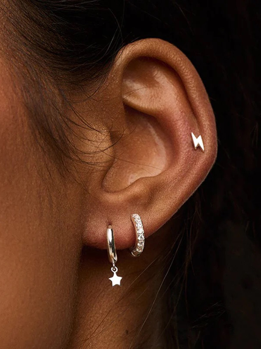 Featuring a silver lightning bolt stud, a gorgeous cubic zirconia pave stone small huggie and a huggie hoop earring with dainty star drop charm.