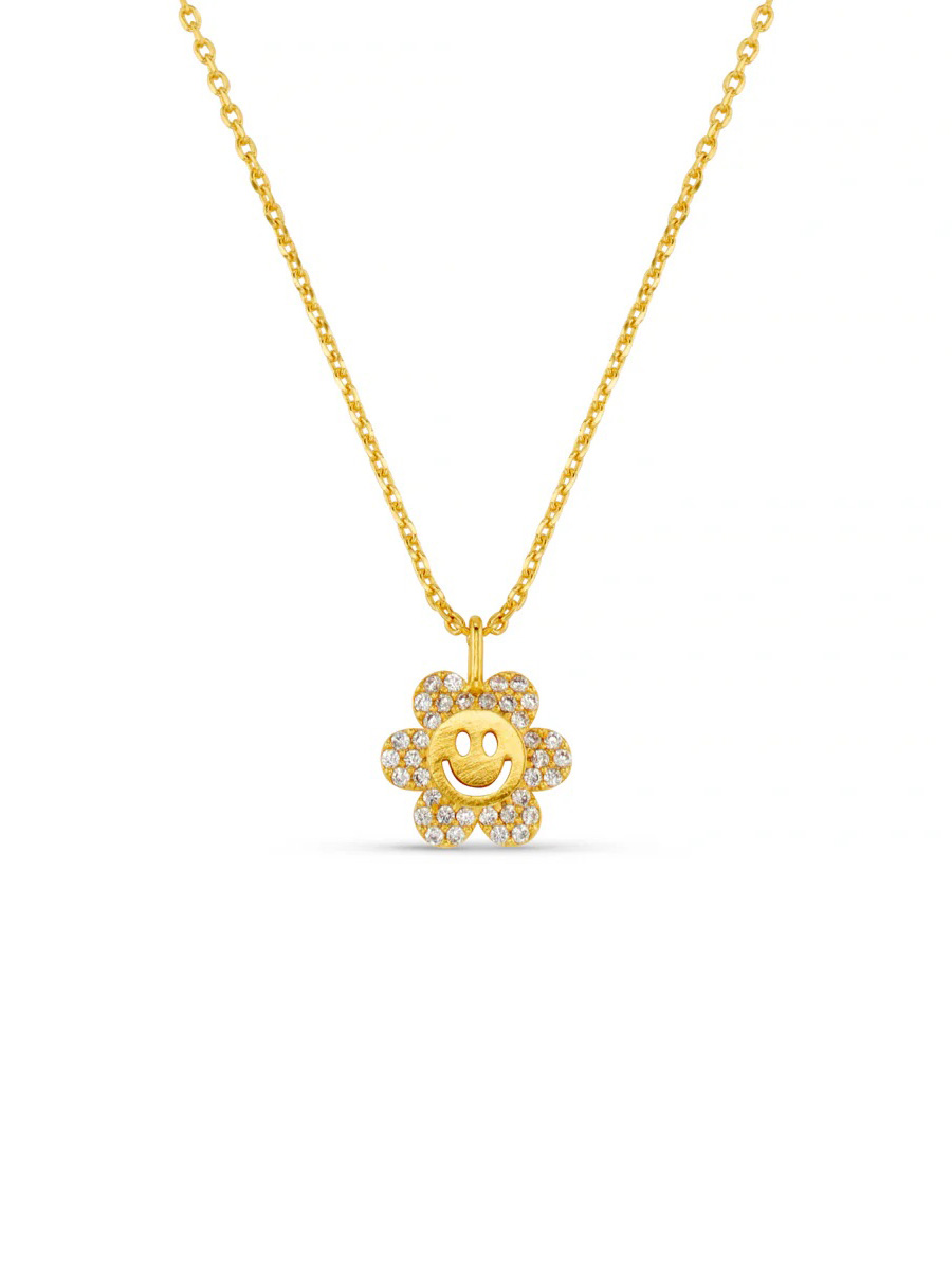 The Pavé Flower Happy Face Charm Necklace, features a cheerful smiley face charm adorned with shimmering pavé stones. Bringing a fun and playful, yet polished touch to your everyday style and a little positivity to those who admire.