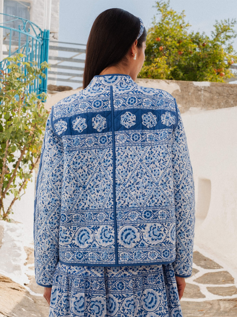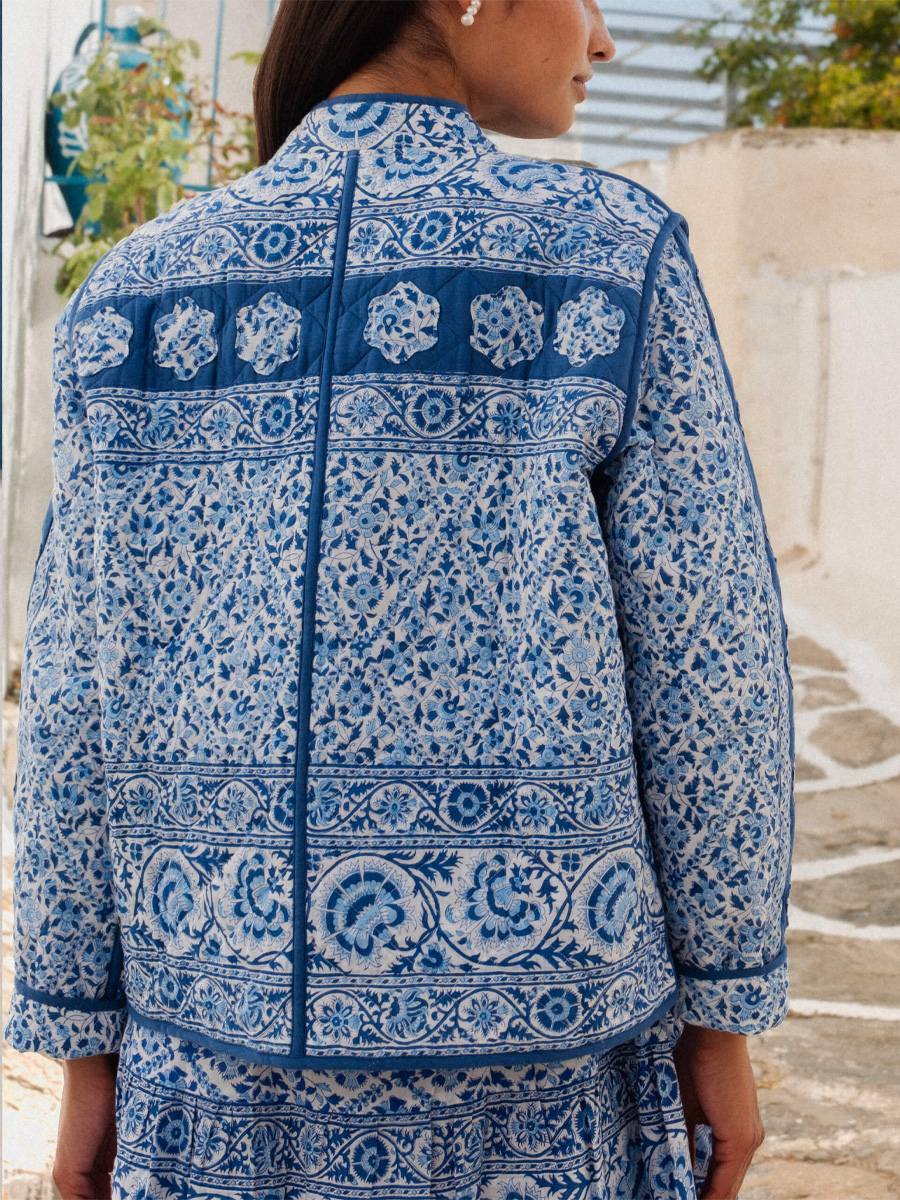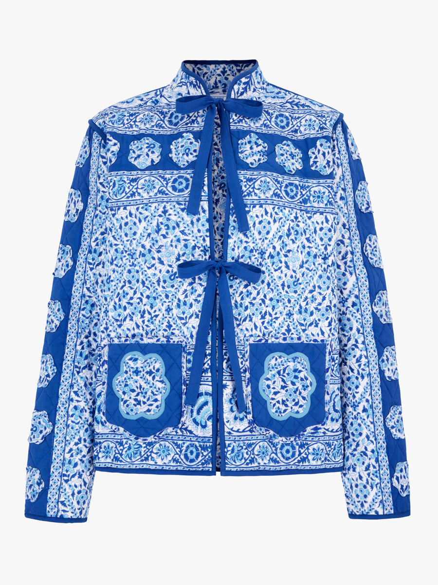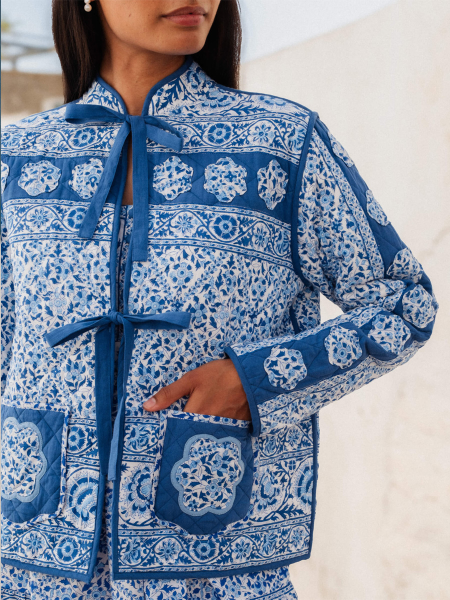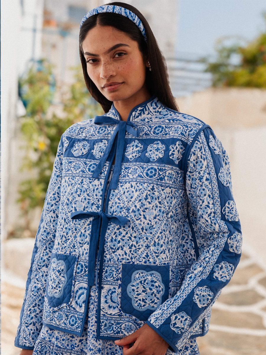 The bestselling Penny jacket has been reimagined for Spring 26, updated with playful appliqué embroidery flowers and statement bows at the centre. Block-printed by hand in timeless shades of blue, the Penny jacket is finished with rich blue piping, appliqué embroidery on the sleeves and statement patch pockets. A true work of art. Pair with jeans for everyday ease.
