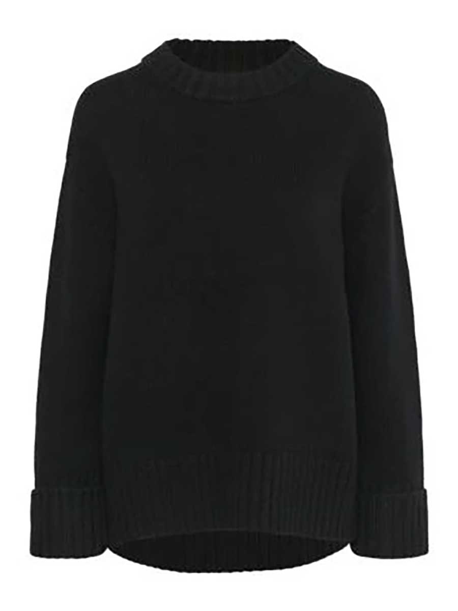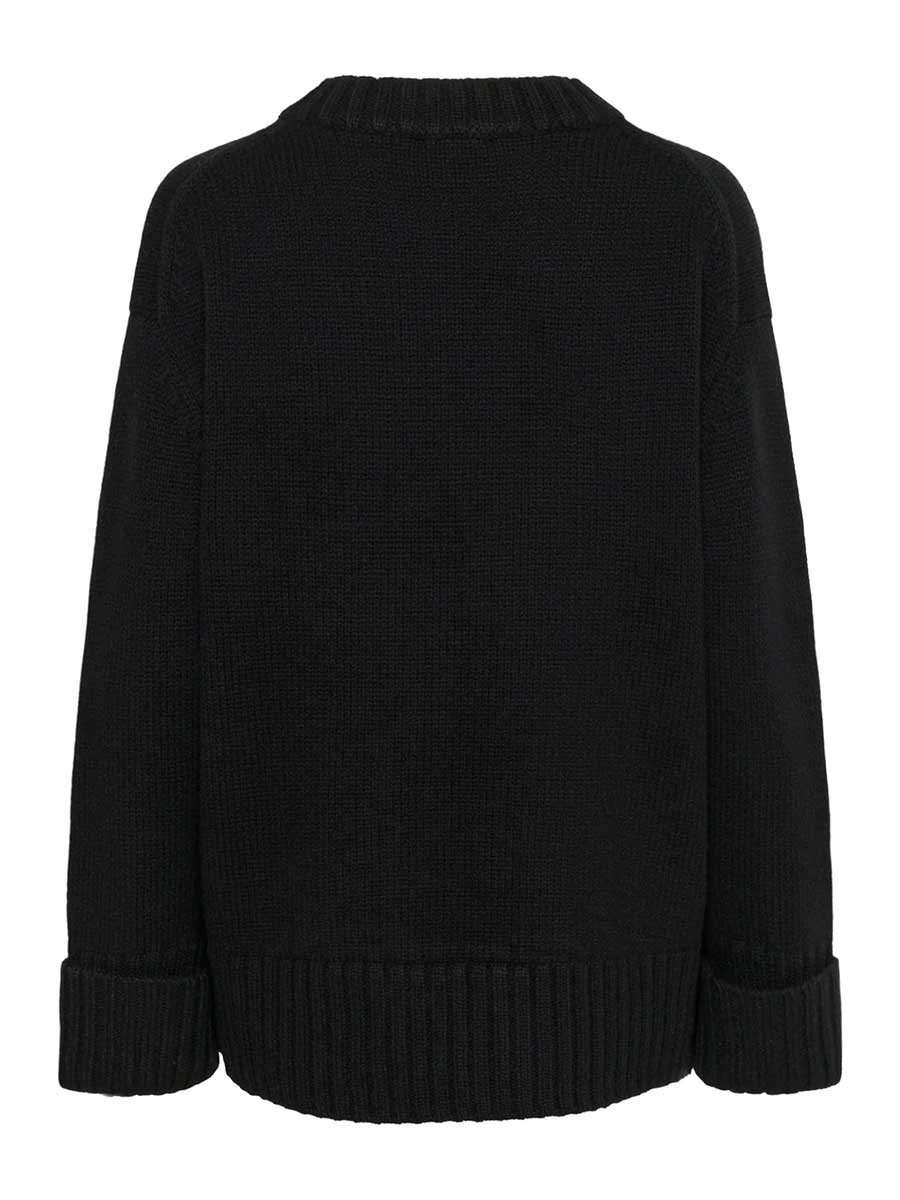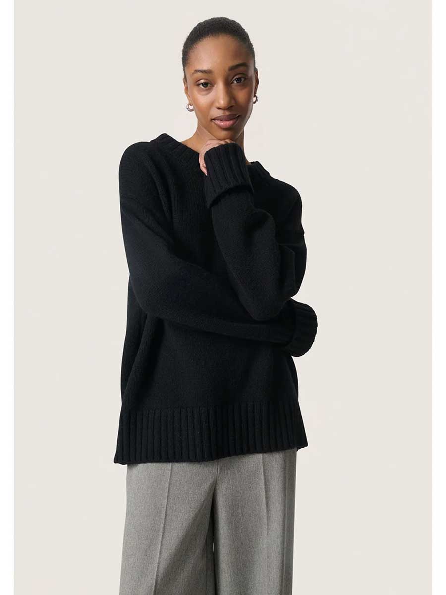 Soft knitted versatile umper in black crafted from 100% wool. Designed with a relaxed fit, dropped shoulders, wide ribbed trims and a round neckline – ideal for layering and cooler days.