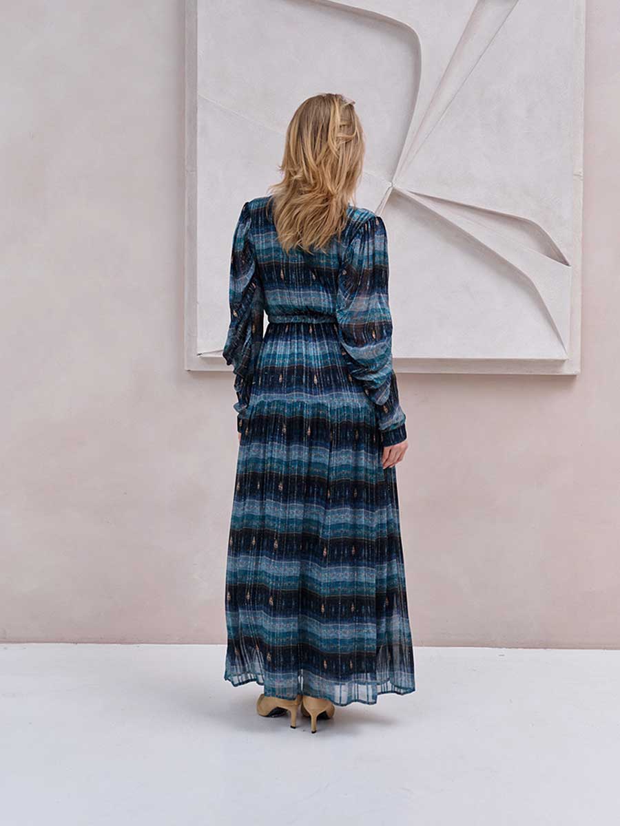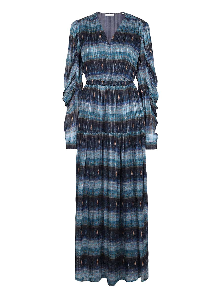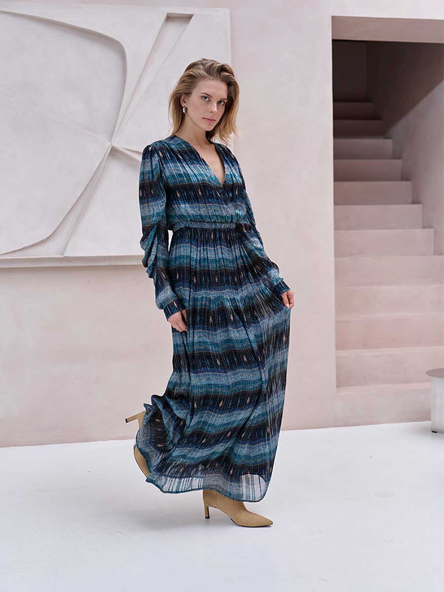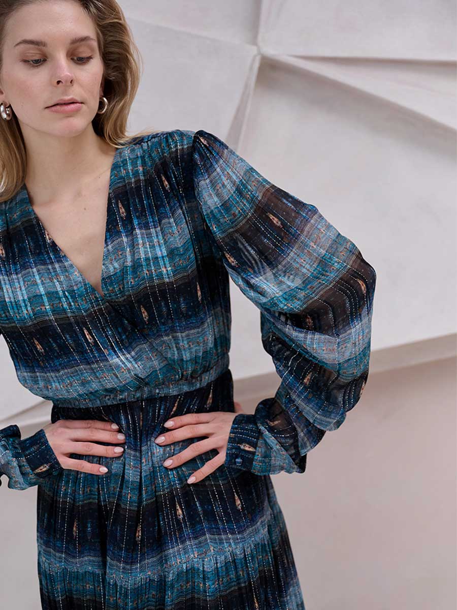 Printed in a blue-toned vintage carpet motif, the Eloise Dress is crafted from a viscose-lurex blend for a subtle sheen. Designed with an elasticated waist and draped sleeves that fall elegantly over the forearms, it combines heritage print with modern proportions.
