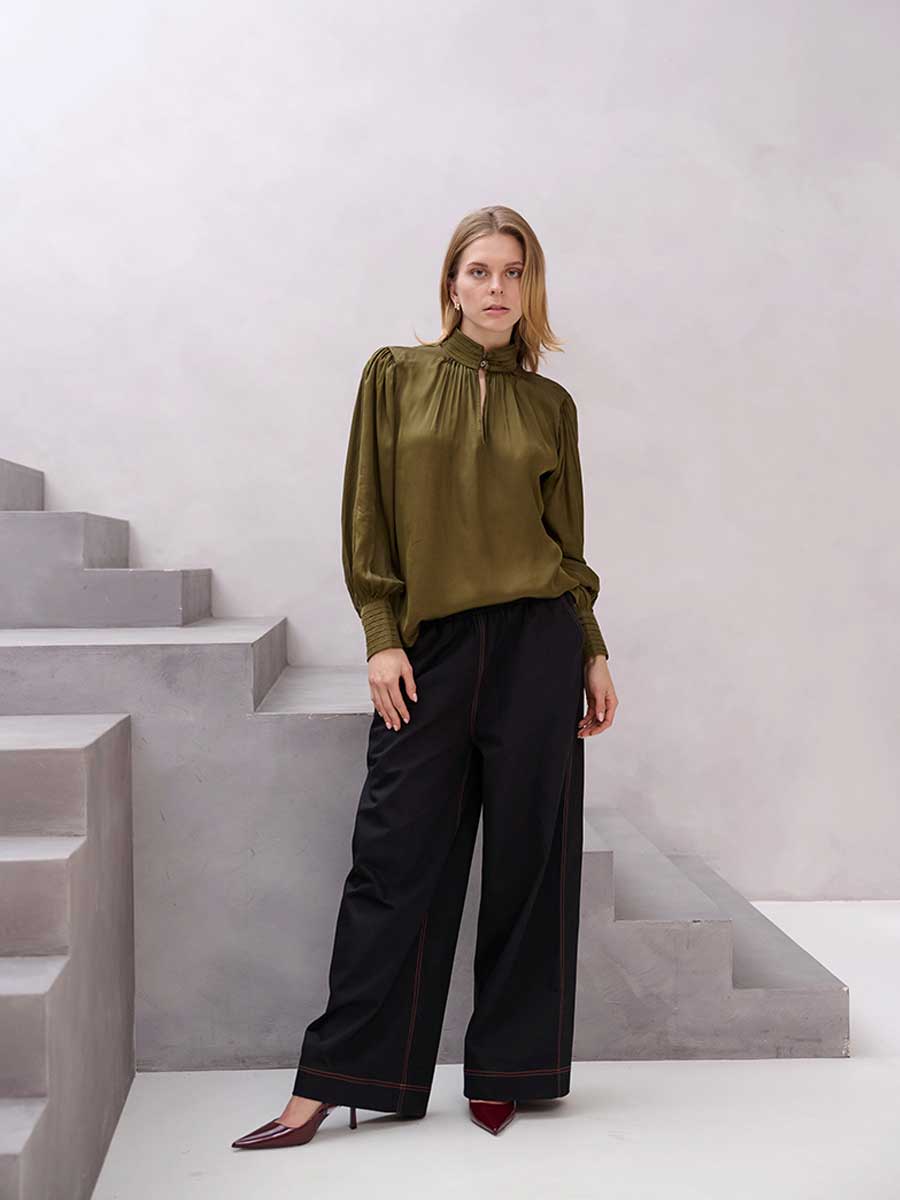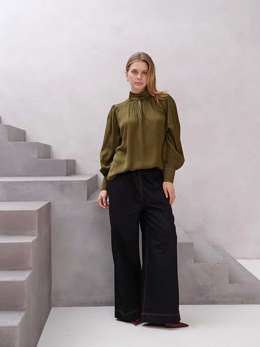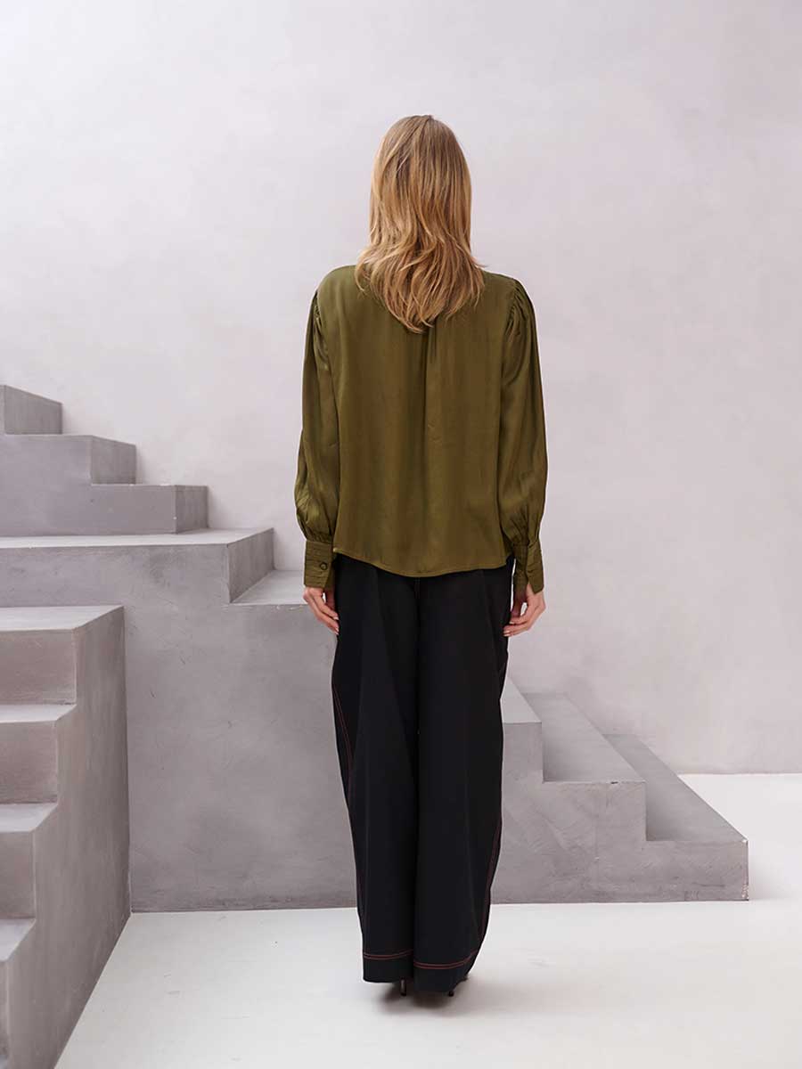 The Lina Blouse is a relaxed silhouette designed in soft modal with a washed military green tone. It features delicate pleats at the sleeve hem and collar for subtle shape, along with gentle gathers across the front bodice, waist, and back yoke for volume and ease. Its loose fit and lightweight drape make it an effortless wardrobe staple that’s both polished and breathable.