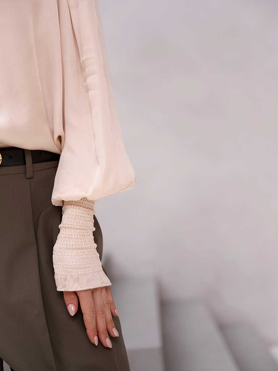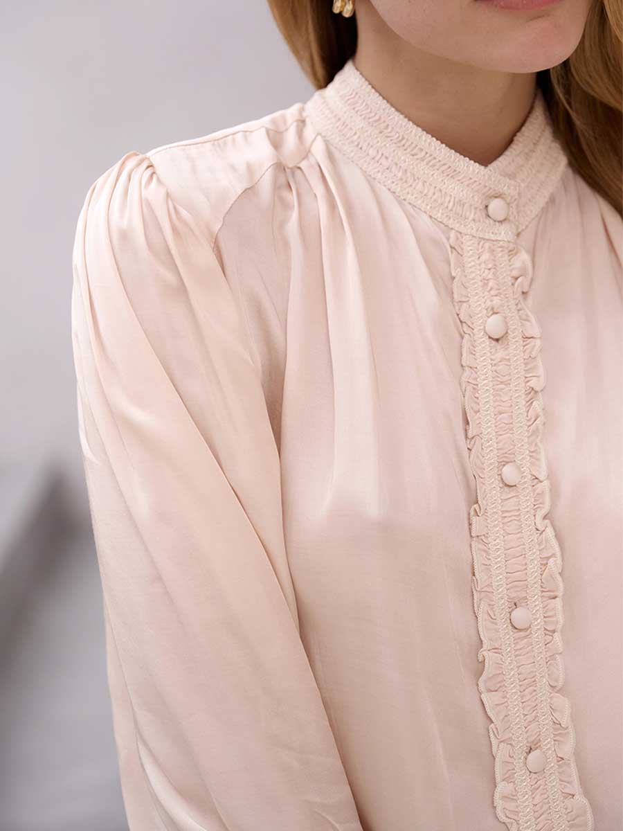 Designed for all-day comfort, the Sofia Shirt is crafted in 100% Modal with a relaxed, true-to-size fit. A smocked front placket adds subtle frill detailing, while the smocked band collar and cuffs introduce texture and structure. Pleated shoulders enhance the structure of the full sleeves without overwhelming the silhouette.